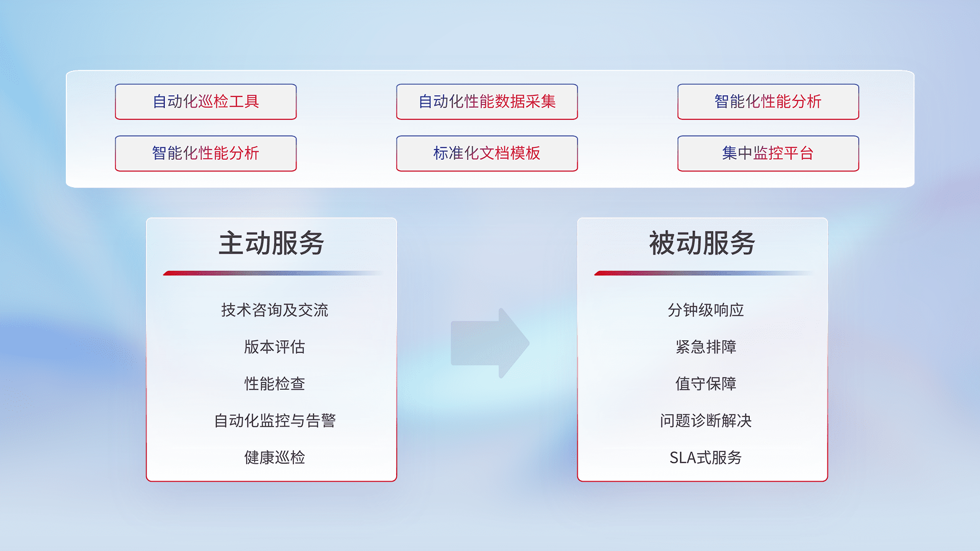 智能化工具和标准化文档,,,,保障服务质量,,,提供主动服务(包含技术咨询、、、、版本评估、、性能检查、、自动化监控与告警、、、、健康巡检)和被动服务包含(分钟级响应、、、紧急排障、、、值守保障、、、问题诊断解决、、SLA服务)。。。
