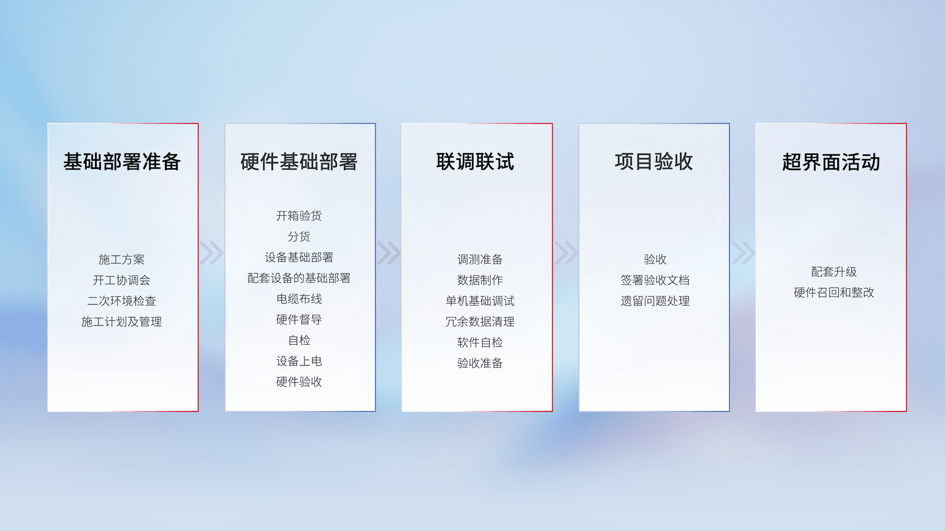 从基础部署准备、、、、硬件基础部署、、联调联试、、、项目验收、、、越界面活动的全过程可追溯,,,,保证施工质量和进度。。。